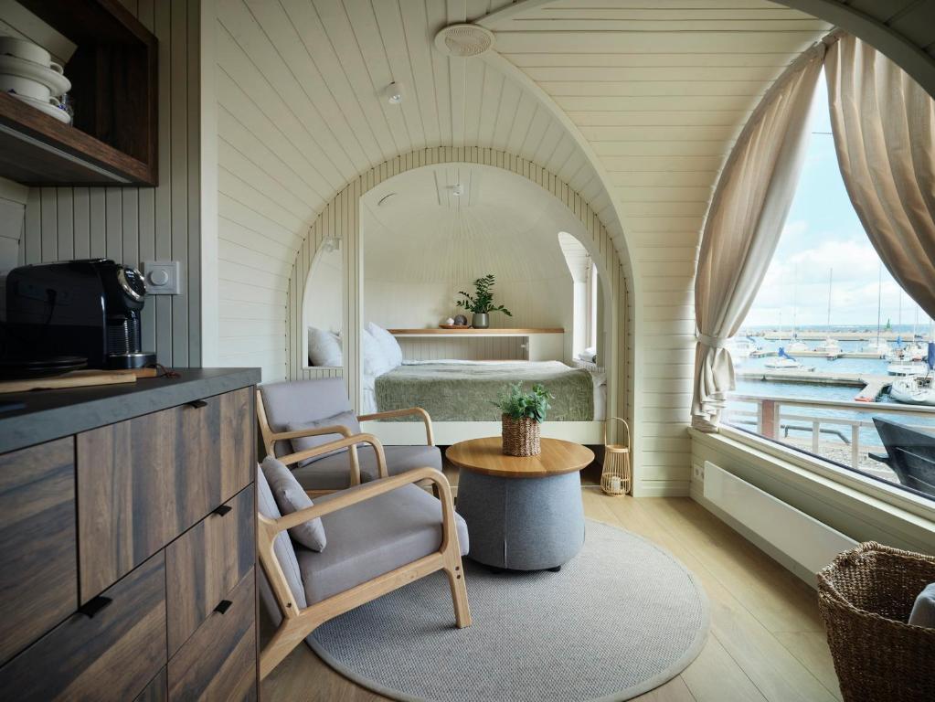 Domki są kompaktowe, ale przytulne, z dużymi oknami wychodzącymi na Zatokę Tallińską i prywatnymi tarasami, idealnymi na spokojne poranki lub drinki o zachodzie słońca. Dysponując zaledwie dziewięcioma pokojami, Iglupark oferuje kameralny pobyt, który ma inspirować do relaksu i kreatywności.